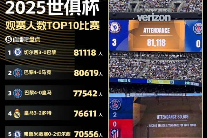 切尔西对阵巴黎的决赛共有81118名观众现场观战,是本届世俱杯观赛人数最多的一场。